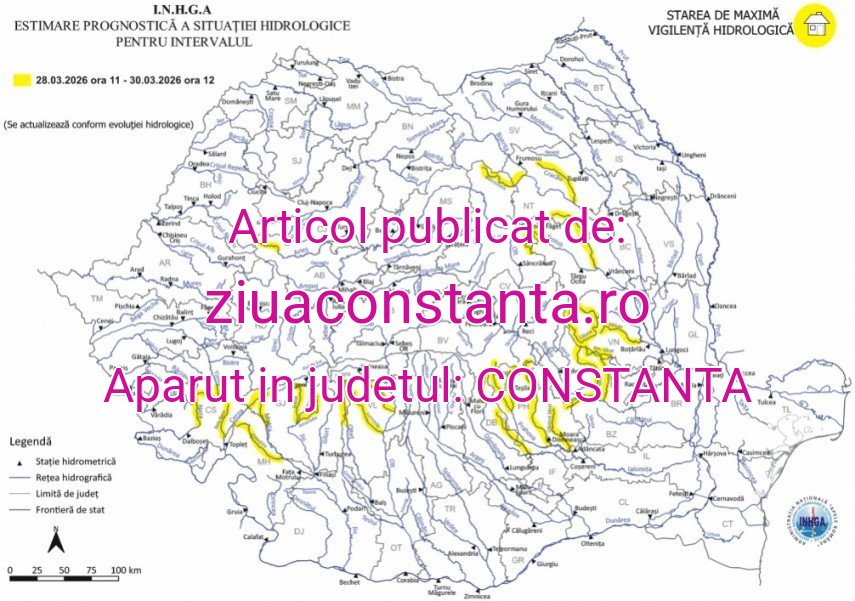 Institutul Național de Hidrologie și Gospodărire a Apelor a emis o atenționare cod galben de inundații pentru râuri din județele Caraș Severin, Gorj, Mehedinți, Vâlcea, Alba, Cluj, Dâmbovița, Ialomița, Buzău, Vrancea, Harghita, Bacău, Neamț, Covasna, Prahova și Ilfov.Codul galben este valabil în perioada 28.03.2026 ora 11:00 – 30.03.2026 ora 12:00.Avertizarea hidrologilor este valabilă pe râurile din bazinele hidrografice: Arieș, Timiș, Nera, Cerna, Jiu, Olt, Ialomița, Buzău, Râmnicu Sărat, Putna, Trotuș și Bistrița.Potrivit INHGHA, în intervalul menționat anterior, sunt preconizate scurgeri importante pe versanţi, torenţi şi pâraie, viituri rapide pe râurile mici cu posibile efecte de inundaţii locale şi creşteri de debite şi niveluri pe unele râuri din bazinele hidrografice vizate.Citește și: