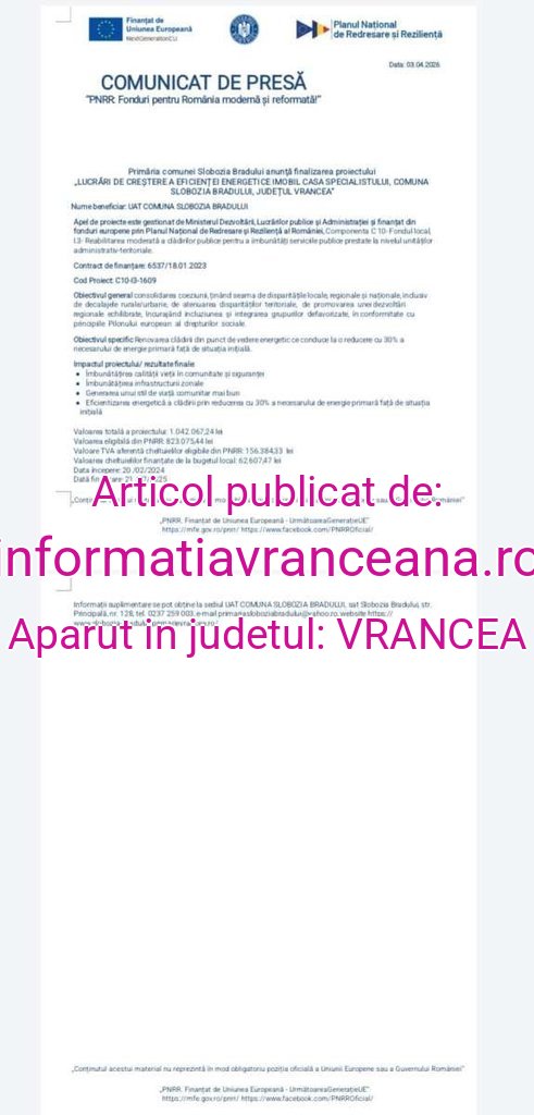 Comunicat de presă Primăria Slobozia Bradului: ”PNRR Fonduri pentru România modernă și reformată!” informatiavranceana.ro 3 aprilie 2026 Acțiune FacebookXPinterestWhatsApp Comunicat de presă Primăria Slobozia Bradului: ”PNRR Fonduri pentru România modernă și… Sursa: https://informatiavranceana.ro/comunicat-de-presa-primaria-slobozia-bradului-pnrr-fonduri-pentru-romania-moderna-si-reformata/ Acțiune FacebookXPinterestWhatsApp Ultimă oră monitoruldevrancea.ro VIDEO/FOTO! Într-o altă viață, oi fi fost țigancă. Azi, mă bucur că sunt romi Robo Stiri - 4 aprilie 2026 monitoruldevrancea.ro VIDEO! Un stol numeros de berze s-a oprit în această seară la Dălhăuți Robo Stiri - 4 aprilie 2026 ziaruldeiasi.ro Un copil de 7 ani a căzut de la etajul unui bloc din Focşani. Minorul era conştient la preluarea de către medici Robo Stiri - 4 aprilie 2026 ziuaconstanta.ro Știri România: Un minor de 7 ani a căzut de la etajul al doilea al unui imobil Robo Stiri - 4 aprilie 2026 Același autor informatiavranceana.ro Mutări în sănătatea vrânceană. Managerul spitalului județean se mută la Casa de Asigurări de Sănătate Vrancea 2 aprilie 2026 informatiavranceana.ro Investim în sănătatea și siguranța oamenilor: Spitalul de la Dumbrăveni, consolidat și modernizat cu fonduri europene 2 aprilie 2026 informatiavranceana.ro Înscrieri pentru clasa de teatru la Centrul Cultural Vrancea 2 aprilie 2026 informatiavranceana.ro De la „mascatul” în miniatură la campioană europeană: Demonstrație de Jiu-Jitsu la școală între un jandarm vrâncean și fiica sa 1 aprilie 2026