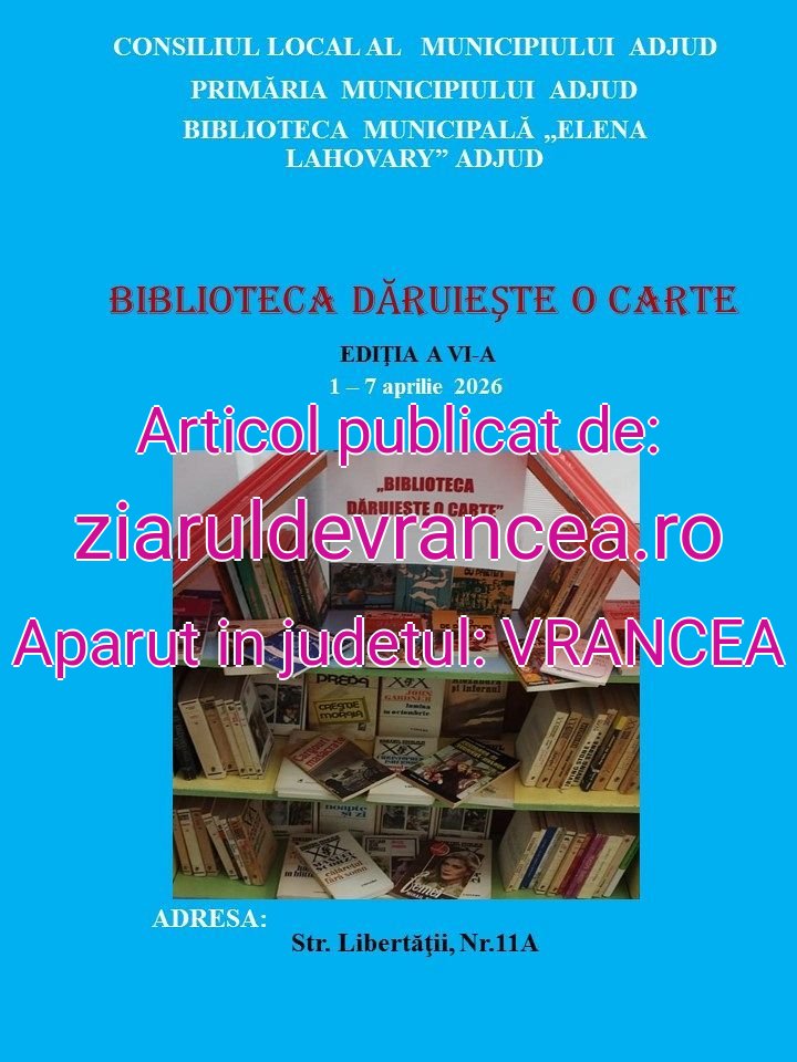În județul Vrancea, lectura prinde din nou viață printr-o inițiativă culturală care pune cartea în centrul comunității. Biblioteca Municipală „Elena Lahovary” din Adjud organizează, în perioada 1 – 7 aprilie 2026, cea de-a șasea ediție a proiectului „Biblioteca dăruiește o carte”, un demers dedicat promovării lecturii și apropierii publicului de universul cărților.
